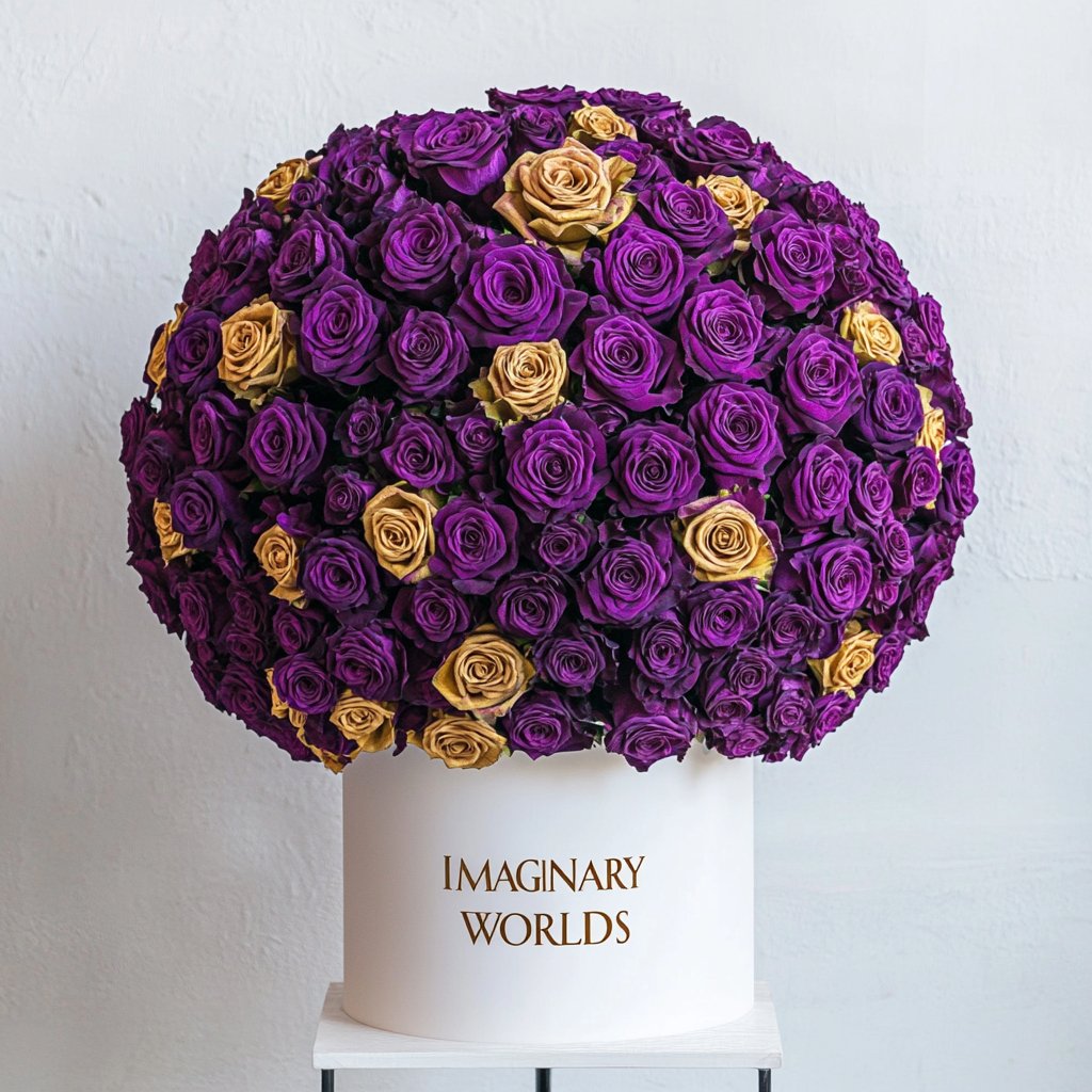Enter the regal and opulent world of the Ramo Buchon Royal Radiance. This luxurious arrangement is offered in six grand sizes: 16, 30, 50, 75, 100, and over 300 splendid roses in a majestic blend of purple and gold, each meticulously preserved to showcase their breathtaking beauty and grandeur. Encased in an exquisite red velvet round hat box, this bouquet stands as a symbol of nobility and lavish splendor. It's the perfect expression for any celebratory moment, whether it's an upscale gala, a thoughtful gift, or simply to add a touch of royal elegance to your environment.